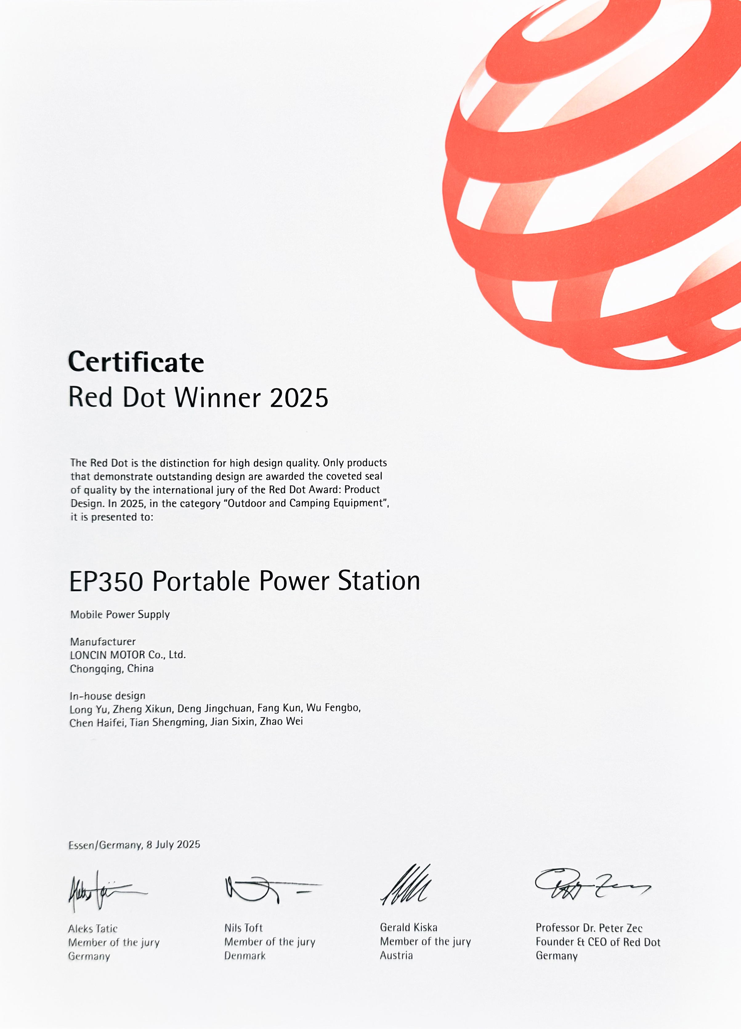 近日,备受瞩目的国际顶级设计奖项——德国红点奖正式公布获奖名单。隆鑫通机EHOM品牌便携储能电源EP350凭借其创新设计脱颖而出,成功斩获2025年德国红点产品设计奖。这一荣誉不仅是对隆鑫通机储能研发团队在卓越设计与技术实力的高度认可,更彰显了其在创新解决方案领域的优异表现。