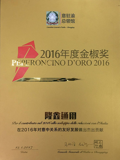 1月12日晚,隆鑫通用受邀出席意大利驻重庆总领事馆设立三周年庆典、第三届“情系意大利之秋”文化季闭幕仪式暨2016年度金椒奖颁奖典礼,并荣获总领馆颁发的金椒奖。