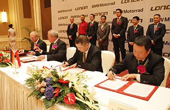 October 23, 2013, BMW Motorrad President Stephan Schaller , procurement Vice-President Andreas Schuster-Woldan and their party visited Loncin. Chongqing Vice Mayor Chen Heping, Deputy Director of Chongqing Economic & Information Technology Commission Zhou Qing, Party Secretary of CPC Chongqing Jiulongpo Committee Ding Hong, founder of Loncin & Loncin Group Chairman Tu Jianhua, Board Chairman of Loncin Gao Yong, and Vice President Wen Xiaogang met guests of BMW Motorrad, and attended signing ceremony of Loncin - BMW Agreement on Long-term Supply of Brand-new Large Displacement Engine.