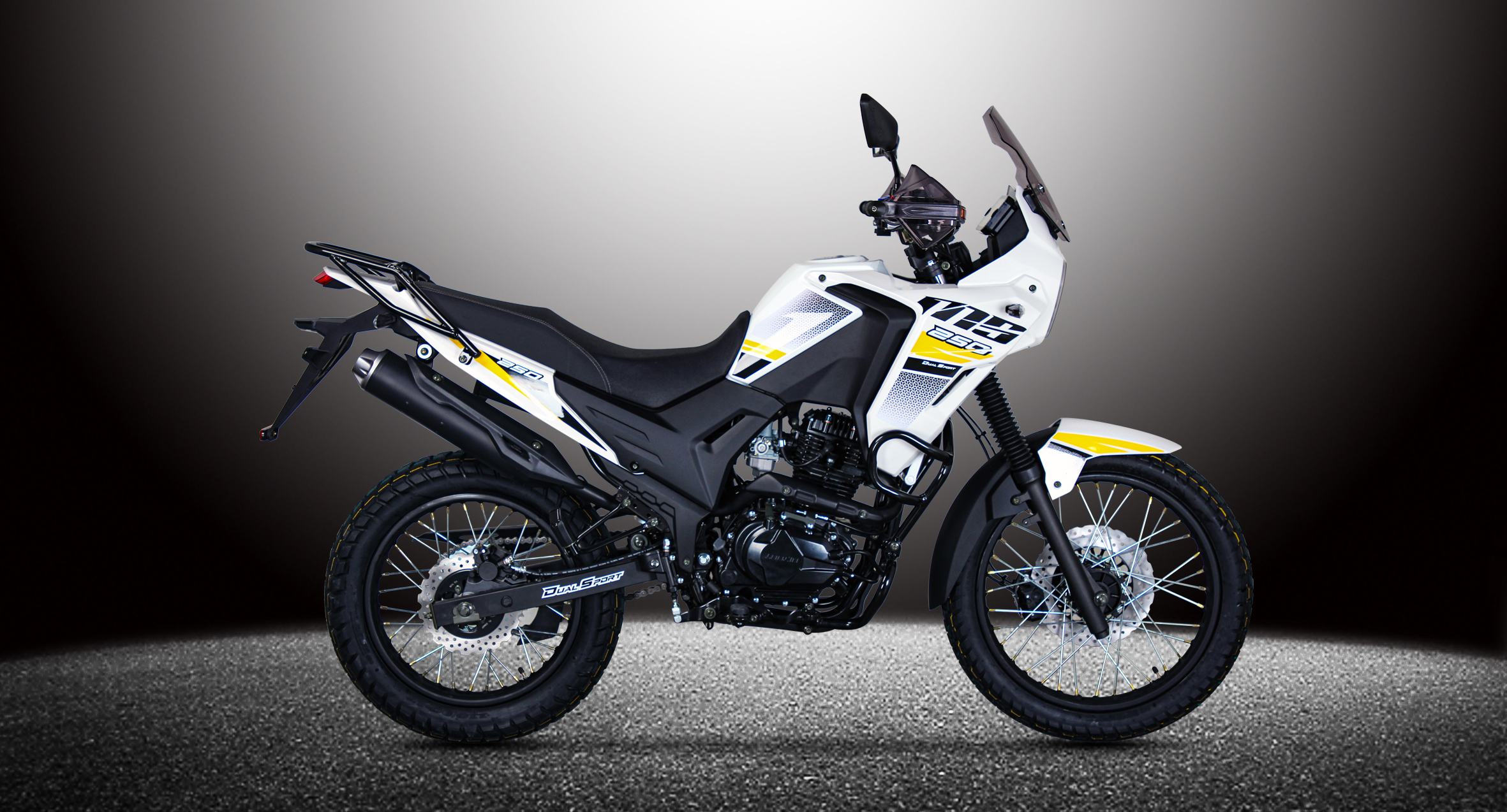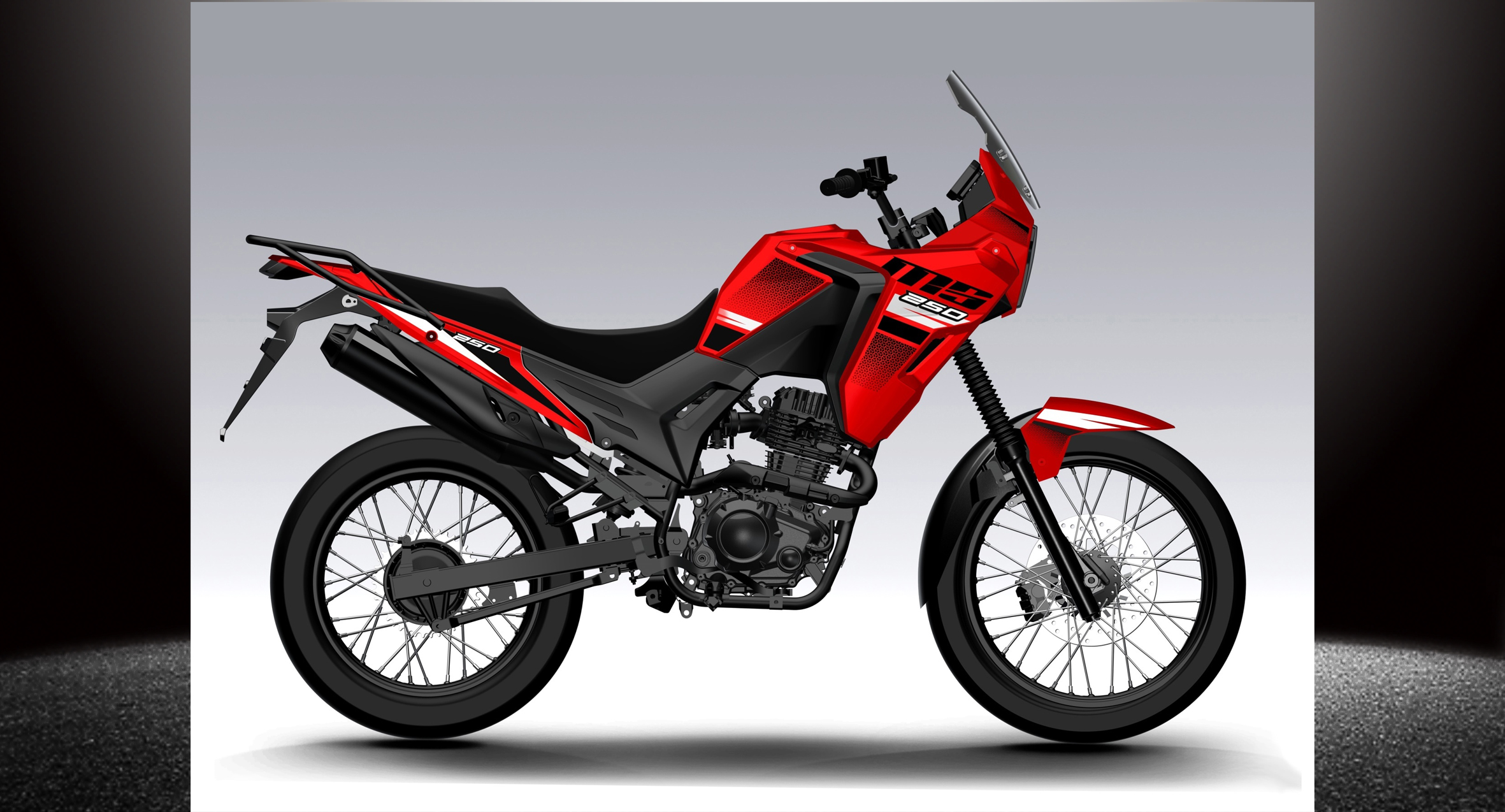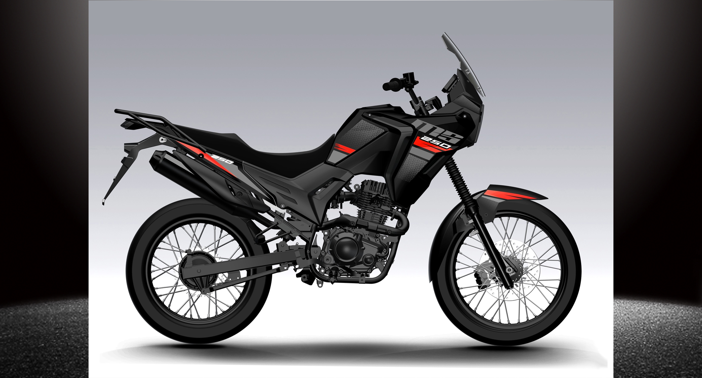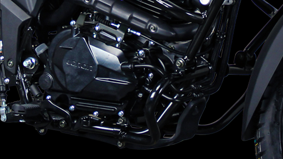 RE250, built-in counterweight engine, Oil cooled, E-start only, 6-speed, Spoke wheel, Tortoise-backed tyre, Fr. & Rr. disc brake, Centre placed absorber, Digital meter, Full LED lights, Emergency light, USB charging, Windshield, Hand protector, Rear carrier, Bumper, Half chain case.